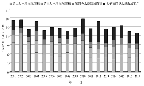 2001年~2017年夏季管辖海域未达到第一类海水水质标准的各类海域面积变化情况 二是海洋功能区环境满足使用要求。海洋倾倒区环境状况基本保持稳定,倾倒活动未对周边海域生态环境及其他海上活动产生明显影响;海洋油气区水质和沉积物质量基本符合海洋功能区环境保护要求,环境质量状况较上年有所改善;重点监测的海水浴场、滨海旅游度假区、海水增养殖区环境质量状况基本满足沿海生产生活用海需求。 三是陆源入海排污口达标排放次数比率有所升高。监测的重点陆源入海排污口达标排放次数占监测总次数的57%,连续3年有所升高。其中,全年各次监测均达标的入海排污口119个,占比较上年增加6.8%。 四是赤潮、绿潮灾害面积大幅减少。2017年,管辖海域共发现68次赤潮,发现次数与上年相同,累计面积为3679平方公里,比上年减少51%,低于近5年平均水平;黄海浒苔绿潮最大分布面积29522平方公里,最大覆盖面积281平方公里,均比上年减少近一半,为近5年最小。 该负责人指出,经过调查,近岸海域环境问题依然突出。主要体现在近岸局部海域污染依然严重,典型海洋生态系统健康状况不佳,陆源入海污染压力仍较大,海洋环境风险仍然突出等方面。 《2017年中国海洋灾害公报》显示,2017年,各类海洋灾害共造成直接经济损失63.98亿元,死亡(含失踪)17人。与近10年平均状况相比,2017年海洋灾害直接经济损失和死亡(含失踪)人数均低于平均值。