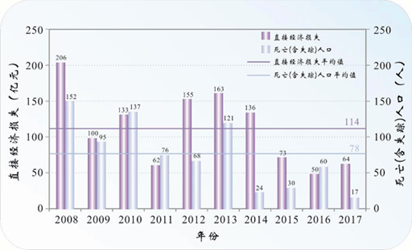 2008年~2017年海洋灾害直接经济损失和死亡(含失踪)人数 其中,2017年,因风暴潮灾害造成的直接经济损失55.77亿元,占总直接经济损失的87%。风暴潮灾害最严重的省(自治区、直辖市)是广东省,因灾直接经济损失53.61亿元,占风暴潮灾害总直接经济损失的96%。因海浪灾害直接经济损失0.27亿元,死亡(含失踪)11人。海冰灾害影响我国渤海和黄海北部海域,造成直接经济损失0.01亿元,为近5年平均值(0.75亿元)的1%。 《2017年中国海平面公报》对2017年海平面变化数据进行了全面分析。结果表明,中国沿海海平面变化总体呈波动上升趋势。1980年至2017年,中国沿海海平面上升速率为3.3毫米/年,高于同期全球平均水平。 数据显示,2017年,中国沿海海平面较常年(将1993年~2011年定为常年时段,简称常年)高58毫米,比2016年低24毫米,为1980年以来的第4高位。中国沿海近6年的海平面均处于30多年来的高位。2017年,中国各海区沿海海平面变化区域特征明显。与常年相比,渤海、黄海、东海和南海沿海海平面分别高42毫米、23毫米、66毫米和100毫米。与2016年相比,渤海、黄海和东海均下降,降幅分别为32毫米、43毫米和49毫米;南海沿海海平面上升28毫米。 |
