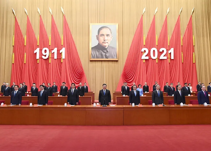 10月9日,纪念辛亥革命110周年大会在北京人民大会堂隆重举行。中共中央总书记、国家主席、中央军委主席习近平在大会上发表重要讲话。新华社记者 庞兴雷 摄 李克强、栗战书、汪洋、王沪宁、赵乐际、韩正、王岐山出席大会。 人民大会堂大礼堂气氛庄重热烈。主席台上方悬挂着“纪念辛亥革命110周年大会”会标,后幕正中是孙中山先生画像,10面红旗分列两侧,上面悬挂的“1911”“2021”字标格外醒目。 上午10时,大会开始。全体起立,高唱国歌。