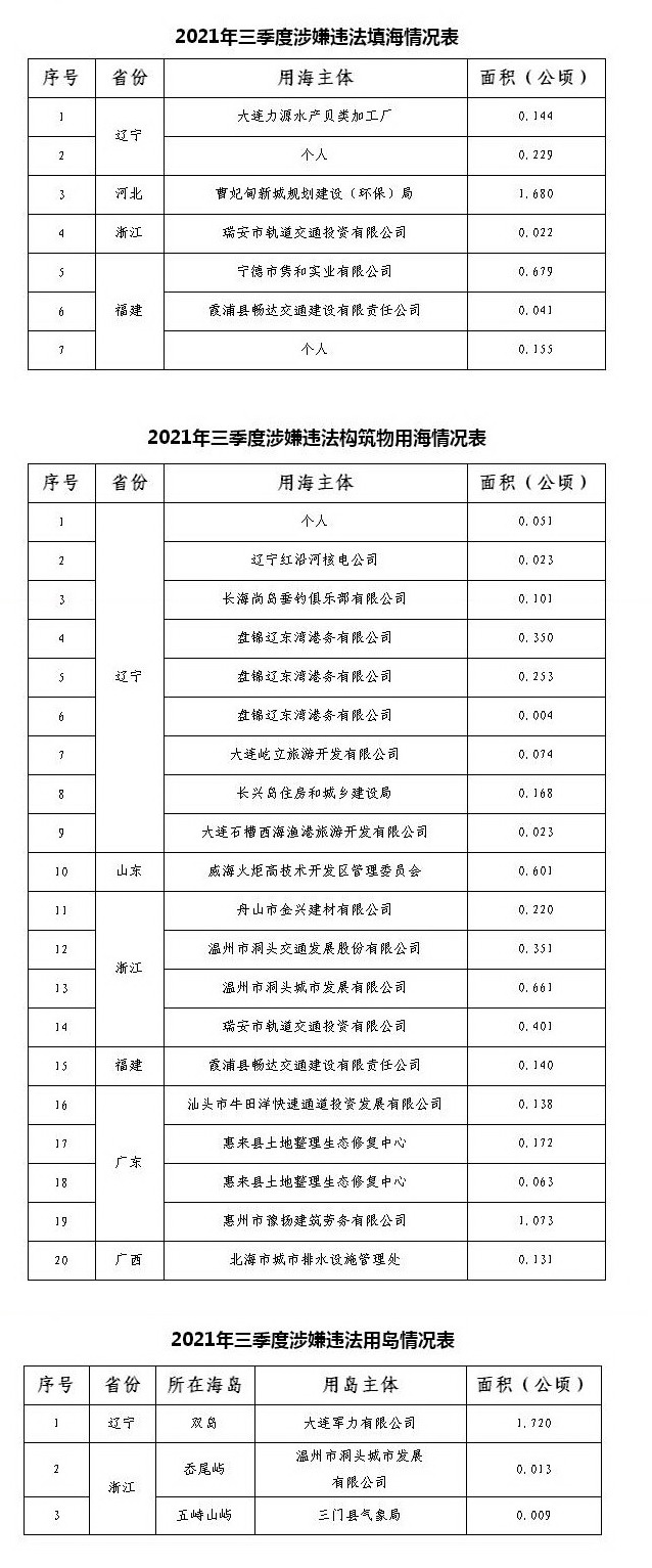 2021年第三季度,各级自然资源主管部门继续坚持“早发现、早制止、严查处”,及时发现并制止违法用海用岛活动的苗头倾向,通报并移交查处涉嫌违法用海用岛案件,坚决将违法用海用岛消除在萌芽状态。 第三季度发现并制止涉嫌违法填海7处,涉及海域面积约2.95公顷。其中,辽宁省2处,涉及海域面积约0.37公顷;河北省1处,涉及海域面积约1.68公顷;浙江省1处,涉及海域面积约0.02公顷;福建省3处,涉及海域面积约0.88公顷。发现并制止跨海桥梁、码头、堤坝等涉嫌违法构筑物用海20处,涉及海域面积约5.00公顷。其中,辽宁省9处,涉及海域面积约1.05公顷;山东省1处,涉及海域面积约0.60公顷;浙江省4处,涉及海域面积约1.63公顷;福建省1处,涉及海域面积约0.14公顷;广东省4处,涉及海域面积约1.45公顷;广西壮族自治区1处,涉及海域面积约0.13公顷。发现并制止涉嫌违法用岛3处,面积约1.74公顷。其中,辽宁省1处,面积约1.72公顷;浙江省2处,面积约0.02公顷。上述涉嫌违法用海用岛案件均已移交有关执法机关依法进行查处(清单附后)。  |