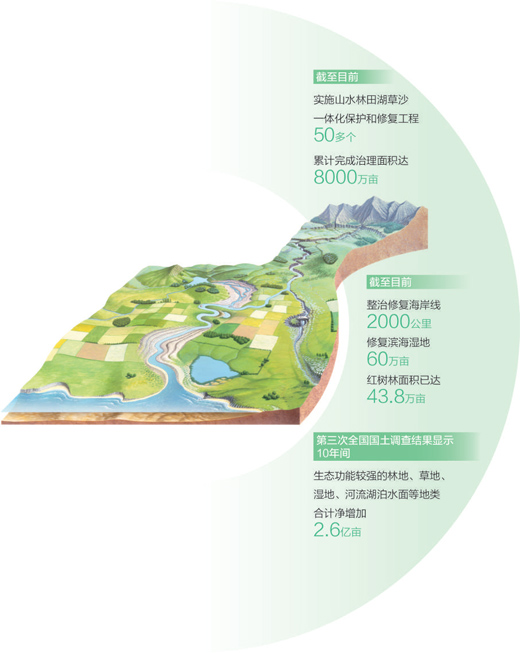 2023年,我国自然资源保护和利用水平不断提高,国土空间支撑能力逐步增强,生态系统质量持续好转。 1月15日至16日,2024年全国自然资源工作会议在京召开,总结2023年全国自然资源系统各项工作取得的新突破新成效,谋划部署2024年重点工作任务。 自然资源保护和利用水平不断提高,筑牢国家生态安全屏障 自然资源要素保障政策供给提质增效。2023年,《自然资源部关于进一步做好用地用海要素保障的通知》发布,涉及国土空间规划、用地审查报批、节约集约用地与资产供应、优化项目用海用岛审批程序等内容。土地、矿产、海洋、林草等各类自然资源要素有序调整,为促进绿色低碳发展聚力赋能。 自然资源节约集约利用水平不断提高。紧盯严控新增占用、盘活存量土地两个环节,推动最严格的节约用地制度落地,自然资源部门继续实施“增存挂钩”机制,全年处置批而未供和闲置土地872万亩,成效明显。公布首批258个自然资源节约集约示范县(市)名单。 自然资源部积极推进山水林田湖草沙一体化保护和修复工程、历史遗留废弃矿山生态修复示范工程和海洋生态保护修复项目,筑牢国家生态安全屏障。鼓励和支持社会资本参与生态保护修复,引导政策性金融投入资金3500亿元。截至目前,我国已部署实施山水林田湖草沙一体化保护和修复工程50多个,累计完成治理面积达8000万亩。 与此同时,矿山、海洋生态修复这两张“特色名片”也在不断擦亮。持续指导各地开展历史遗留废弃矿山生态修复,“十三五”以来,全国累计修复治理面积超30万公顷。扎实推进蓝色海湾整治行动、海岸带保护修复工程、红树林保护修复专项行动。目前,已整治修复海岸线2000公里、修复滨海湿地60万亩;红树林面积已达43.8万亩,我国成为世界上少数几个红树林面积净增加的国家之一。 我国自然资源保护和利用水平不断提高,国土空间支撑能力逐步增强,生态系统质量持续好转。第三次全国国土调查结果显示,10年间,我国生态功能较强的林地、草地、湿地、河流湖泊水面等地类合计净增加2.6亿亩,这为持续提升陆海生态系统碳汇能力奠定了坚实的基础。 维护资源资产权益,履行所有者职责基础更加坚实。自然资源和不动产统一确权登记深入推进。上海崇明东滩国际重要湿地等49个重点区域自然资源确权登记完成公告登簿,自然资源资产管理改革不断深化。全民所有自然资源资产所有权委托代理机制、自然资源领域生态产品价值实现机制等试点任务全面完成。 优化国土空间格局,助力经济社会高质量发展 2023年,全国国土空间规划纲要绘就的崭新蓝图,渐次在广袤的华夏大地上舒展开来,为推进城乡融合和区域协调发展提供强劲支撑。 国土空间规划体系逐步完善。国务院已批复18个省级国土空间规划,全国100%的市级规划和97%的县级规划已报审批机关审查。部署国土空间详细规划工作。推进国土空间治理数字化转型,推动建设国土空间规划实施监测网络。 “三条控制线”管控不断加强。开展耕地和永久基本农田划定成果核实处置。首次将生态保护红线实施情况纳入国家自然资源督察范畴。完善城镇开发边界管理政策。“三区三线”全面划定,让主体功能区战略精准落地,“三条控制线”成为地方调整经济结构、规划产业发展、推进城镇化不可逾越的红线。 助力国家重大战略有效落地。规范开展全域土地综合整治试点,全国累计投入资金4488亿元,综合整治378万亩。2023年,自然资源部指导各地推进356个以乡镇为单元的全域土地综合整治试点,对农村一定空间内各类生态要素统一规划治理,一体化推进包括耕地在内的土地整理、生态保护修复和历史文化保护,以此为抓手进一步促进农村地区国土空间布局优化。 耕地保护硬措施不断完善。自然资源部开展耕地占补平衡专项整治;统筹规范耕地保护卫星遥感监测,着力解决卫片监测图斑下发统筹不够、频次过高、核实举证多等问题;强化督察执法,建立耕地和生态保护“长牙齿”硬措施工作机制。自然资源部公开通报148个违法违规重大典型问题,集中约谈22个问题突出地市政府负责人。 战略性矿产安全保障体系建设扎实推进。自然资源部完成矿产资源国情调查,全面摸清我国矿产资源情况。取得山东莱州金矿等重大找矿突破。自然资源系统统筹矿产勘查开发和生态保护,稳步推进绿色勘查、绿色矿山建设,初步建立绿色勘查开发标准技术体系,逐渐形成了节约高效、环境友好、矿地和谐的绿色矿业发展模式。 锚定自然资源工作定位,服务建设人与自然和谐共生的现代化 自然资源部对2024年重点工作作出8方面部署:坚持量质并重、严格执法、系统推进、永续利用,切实守牢耕地保护红线。扎实开展耕地保护和粮食安全责任制“首考”,改革完善耕地占补平衡制度,建立健全“长牙齿”硬措施,研究推动批量增加耕地;加大勘探开发和增储上产力度,提高战略性矿产资源保障能力。继续深入开展新一轮找矿突破战略行动,深化矿产资源管理改革,加强绿色勘查开发,优化海外矿产资源勘查开发合作;推动海洋经济高质量发展,务实推动极地基础设施和能力建设,提高深远海开发保障能力,维护海洋权益;完善主体功能区制度和“三区三线”政策,加快国土空间规划编制和监督实施,深入推进全域土地综合整治;强化差别化要素保障政策,提升自然