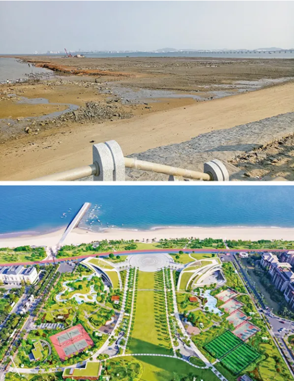 湾区较多、“湾中有湾”的厦门,在国内沿海地区率先提出湾区综合整治理念,实施海堤开口清淤整治,重构红树林岸线,修复沙滩,构建优美海湾人居环境。图为厦门同安湾整治前后对比,上图为整治前画面,下图为整治后画面。 (自然资源部第三海洋研究所供图)