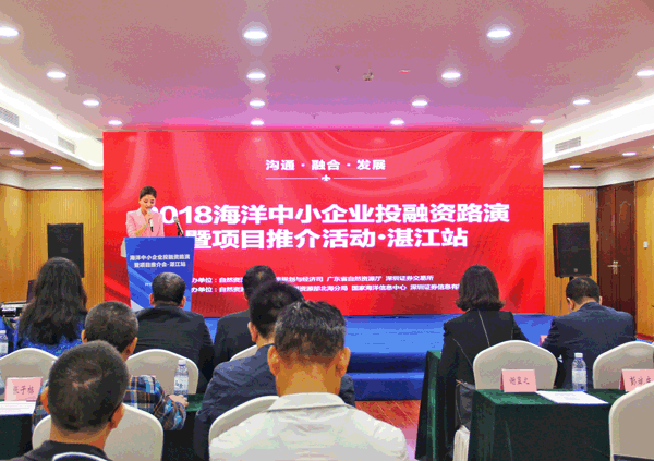 2018年11月22日,自然资源部海洋战略规划与经济司、广东省自然资源厅、深圳证券交易所在广东省湛江市联合举办了海洋中小企业投融资路演暨项目推介活动,北海分局、南海分局具体承办。该活动是2018中国海洋经济博览会系列重要活动之一,旨在贯彻落实习近平总书记在民营企业座谈会上重要讲话精神,搭建海洋中小企业与投资机构的对接平台,促进涉海民营经济发展。自然资源部海洋战略规划与经济司沈君处长为活动致辞,分局海洋经济相关人员赴现场观摩学习。 来自广东、山东、辽宁等3个省的7家涉海民营中小企业以及多位投资机构代表参加了此次活动。路演的企业分布于涉海设备制造业、海洋渔业、海洋信息服务业、海洋旅游业等产业,推介的项目涉及节能船用推进器制造、黄海冷水团智能渔场建设、北斗卫星定位系统研发应用、海洋食品精深加工、渔业休闲和游艇旅游等领域。