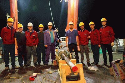 昨日凌晨,正值全国人民辞旧迎新的时刻,印度洋上的大洋科考功勋船“大洋一号”甲板上灯火通明,科考队员们顺利取回了本航次第一个地质取样。 想在超过5000米水深的海底取回沉积物岩芯样品并不是一件简单的事。第一航段首席科学家黄牧、船长赵勇建、装备助理孙元宏和作业组长高伟等提前确定了具体作业方案。“大洋一号”船到达作业位置时已是2018年岁末深夜,科考队员们通过船上地质绞车将提前准备好的重力取样器缓缓放入水中。随着绞车钢缆发出的“咯吱”声,长6米、直径110毫米的重力取样器以每分钟35米的速度直奔海底深处而去。下放3个小时后,取样器离海底200米,在船舶动力定位系统的支持下,绞车开始加速,取样器依靠自身重力一头扎进海底。这之后队员们还不敢放松,又经过3个小时的努力,最后成功将取样器收回甲板,成功取回第一个岩芯样品,这时已是2019年1月1日凌晨一点。