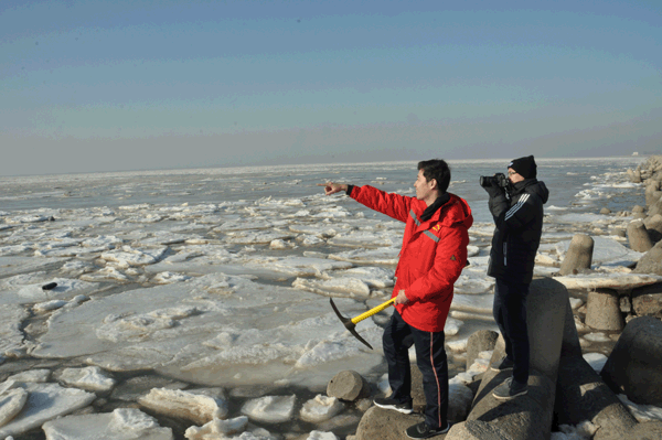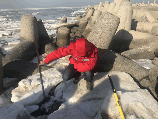 北海局在东营市胜利油田168人工岛海域开展海冰集中调查,观测人员观测海冰分布