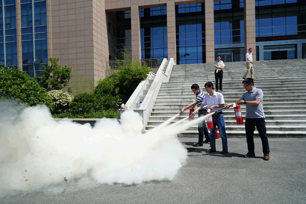 崂山区消防中队消防员为大家演示灭火器使用方法