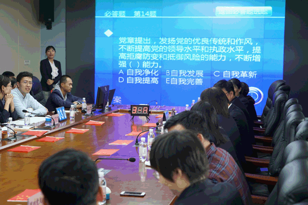 10月21日下午,北海预报中心“不忘初心、牢记使命”主题知识竞赛拉开帷幕。 由各党支部党员代表组成的4支代表队共16名队员参赛,其他成员作为助力团参加。 活动期间,14楼会议室座无虚席、掌声迭起,各代表团高手云集、斗志昂扬,以扎实的理论功底和灵活的应变能力为大家演绎了一场集知识性和趣味性为一体的实力赛、友谊赛! 多轮头脑风暴,只为让活动内容更加入脑入心 作为中心“不忘初心 、牢记使命”主题教育的理论成果检验,同时也作为庆祝新中国成立70周年的活动载体,中心党委决定在十月开展一次旨在“增进支部交流、提升组织活力”的主题知识竞赛。 前期,筹备组多次组织讨论会,充分打磨题目形式,丰富竞赛内容,几易活动方案,最终确定了题库内容和比赛环节设置,并提前发送至各个党支部和科室站,让大家充分热身,有备而战。 聚焦“基本功”,热词齐上阵,足见参赛队员理论功底 为节省比赛时间,充分展现活动效果,筹备组设计了专门的答题软件辅助竞赛,界面新颖,让活动增色不少。 本次竞赛题目,主要来自中心党委前期制作的《主题教育知识竞赛题库》,涵盖了十九大报告、党章、习近平治国理政重要思想、准则和条例、党支部工作条例等内容,除此之外,还增加了时事政治和新闻要点。在答题各个环节中,“天眼”、“嫦娥四号”、“中国女排”、“大兴国际机场”、“袁隆平”这些富有时代气息的“热词”以不同形式“闪亮登场”,让现场人员为之精神振奋;和中心业务相关的“海洋术语”也频繁现身,让大家倍感亲切。 各个代表队参赛队员团结协作、从容应对,现场比分你追我赶,前两个答题环节之后,各队比分依然基本持平,足见各参赛队员的理论功底。 听歌赏图比划猜,题型多样不乏味,“下次还来” 本次竞赛题型多样,通过有问必答、你比划我猜、快手抢答、擂台加时赛和助力团互动等几个环节,将选择、填空、简答、赏图、视唱练耳等囊括其中,题型多样不乏味,听歌赏图接地气。 秒拍抢答器的快手抢答环节,通过手势传递信息的你比划我猜环节,一次次让现场笑声迭起、掌声雷动。在三个环节结束之后,各队比分出现平分情况。最后的擂台加时赛将本次比赛气氛推至高潮。擂台赛的题目全部是题库之外的百科知识,大家在知识的海洋中欢快答题,为团队而战!在一片欢声笑语中,这场集知识性趣味性为一体的竞赛进入尾声。 |