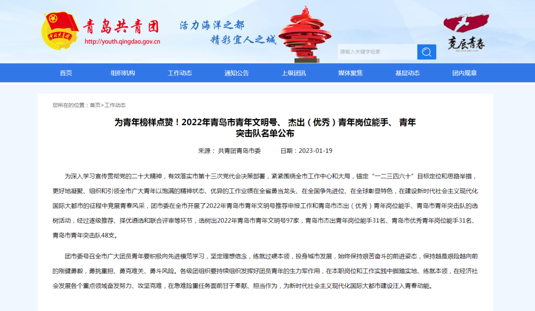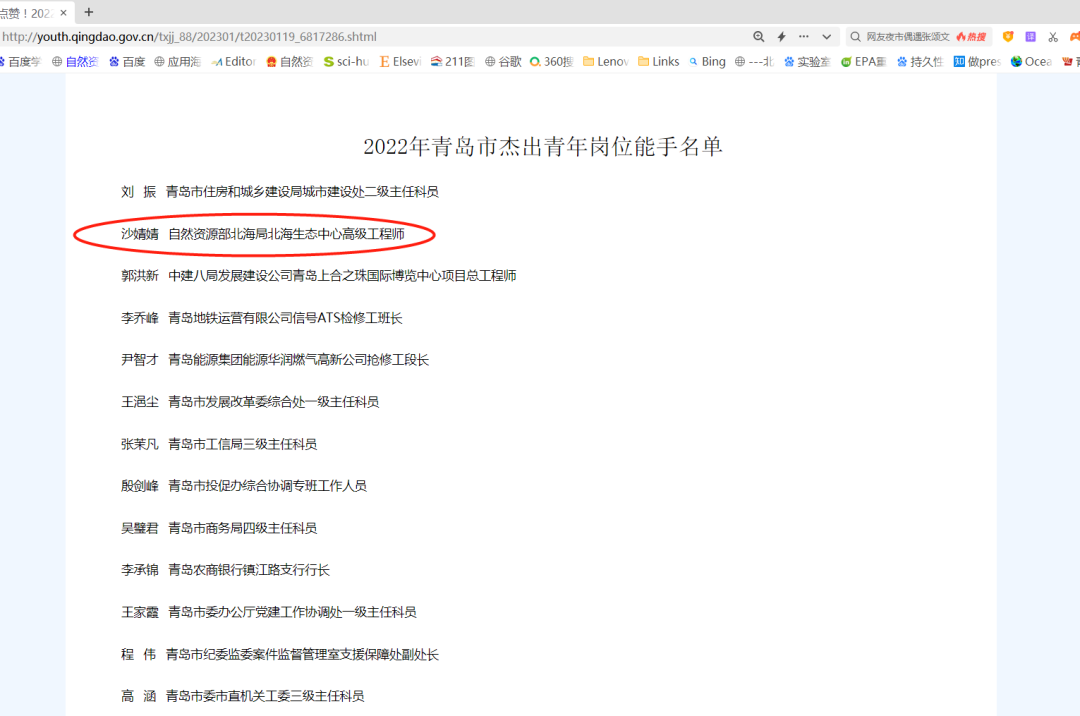 近日,为鼓励先进,进一步发挥青年典型的示范带动作用,共青团青岛市委在全市开展了2022年青岛市杰出(优秀)青年岗位能手的选树活动,经过逐级推荐、择优遴选和联合评审等环节,最终选树出青岛市杰出青年岗位能手31名、青岛市优秀青年岗位能手31名。北海生态中心沙婧婧同志喜获“2022年青岛市杰出青年岗位能手” 荣誉称号,在全市31名杰出青年岗位能手中位列第二。