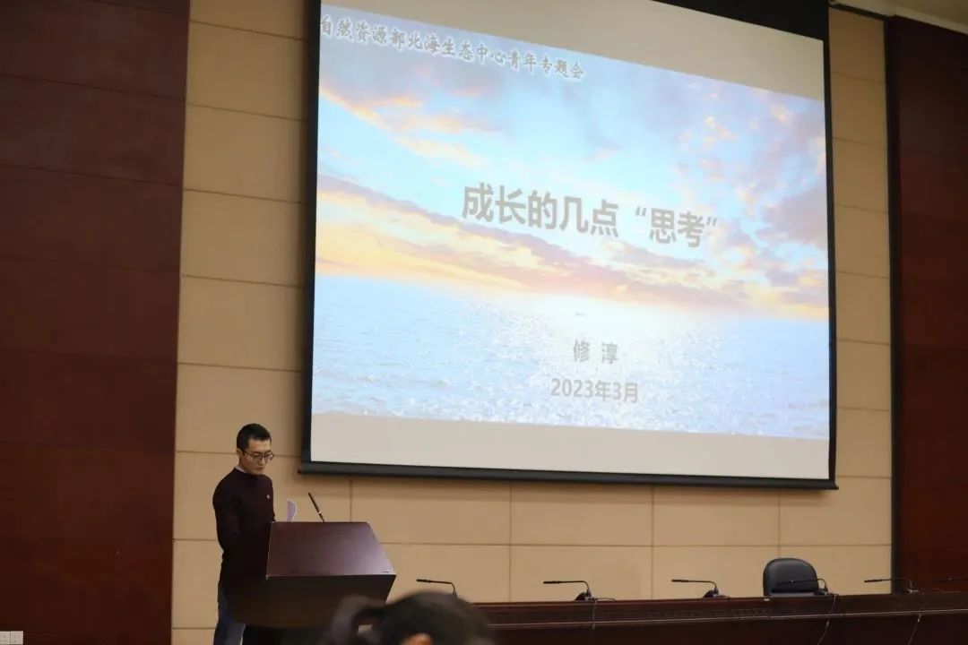 青年代表修淳博士介绍成长思考 接下来,生态中心办公室于庆云博士以“科技创新赋能中心高质量发展”为题,深入浅出的解读了北海局科技创新三年行动方案,深度剖析了中心未来发展所具备的优势和存在的短板;生态中心开发部尹维翰博士则从科技成果转化的角度介绍了中心业务开展情况及核心优势,鼓励青年同志提高站位、勇于承担;生态中心海域技术室修淳博士从个人发展角度,分享了自身在业务工作和科学研究中的经验与困惑,并鼓励青年相互协作、合作共赢。从不同角度给予了中心青年未来工作的发展方向,在与会青年中引起热烈反响。