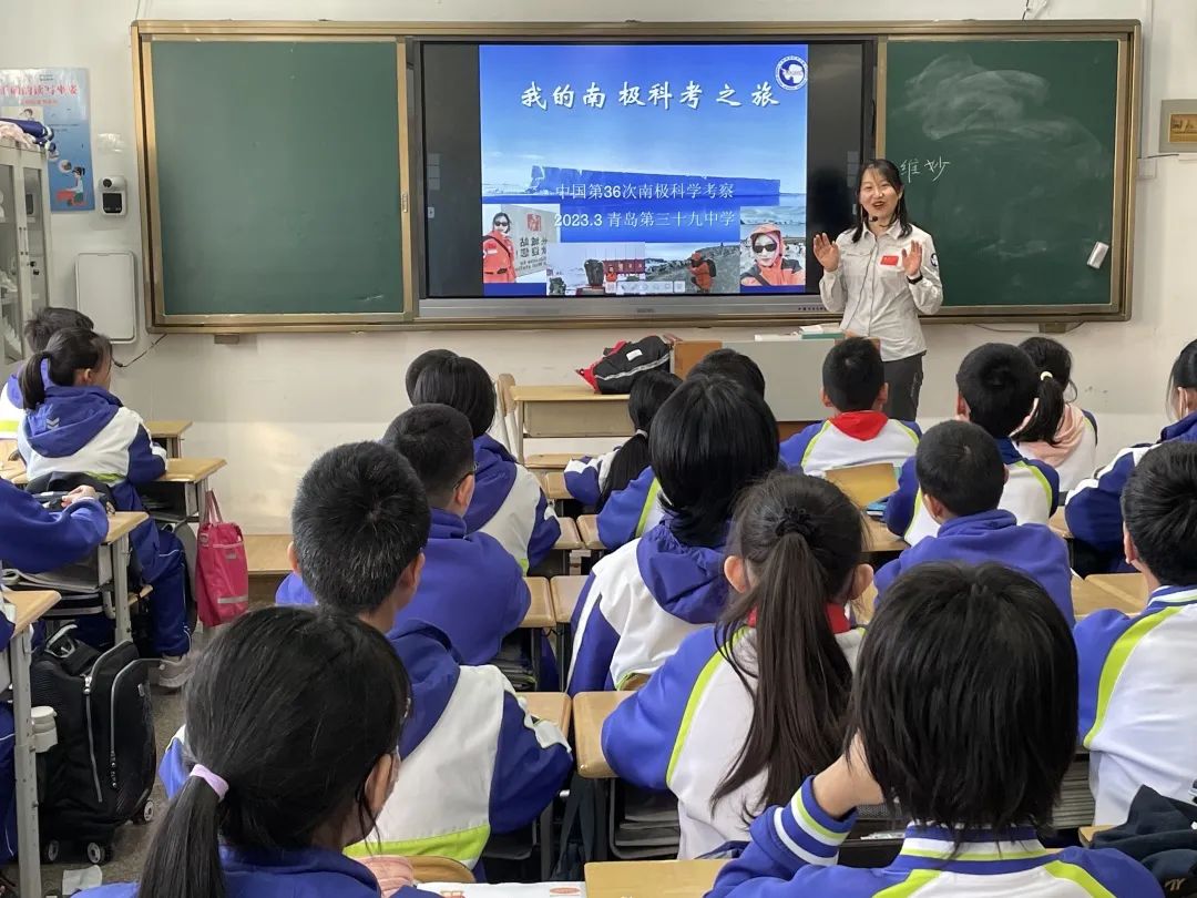 活动中,北海生态中心邓春梅博士及维妙博士为青岛市第39中学55名学生开展了生动精彩的极地科普知识讲座。邓春梅博士结合自己参加第36次南极科学考察的亲身经历,图文并茂地介绍了极地科考所需的陆、海、空各类交通工具,展示了白眉企鹅、阿德利企鹅等南极“明星”物种,带领同学们身临其境一般“环游”南极;讲述了中国科考队员艰辛跋涉、攻坚克难的考察情景,播放了现场工作视频,同学们看到科考人员在没至大腿的雪地中艰难而投入地作业,甚至从陡峭雪坡上急速滑下时,迸发出阵阵惊呼和赞叹。两位博士不时与同学们现场互动,悉心解答大家的问题,维妙博士给踊跃参与的学生送上极地特色小纪念品,现场充满了阵阵笑声和掌声。