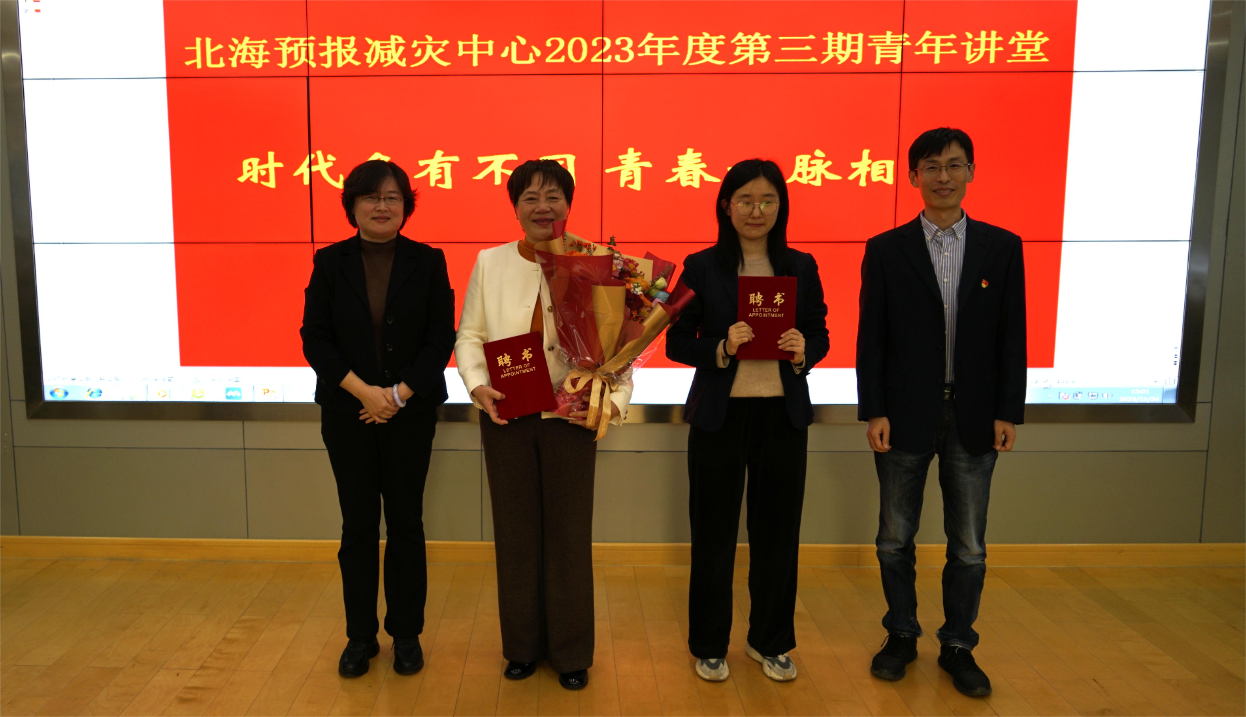 为青年讲堂宣讲员颁发聘书 北海预报减灾中心“青年讲堂”成立于2015年,目前初步形成“精英沙龙”“中心故事荟”“智慧课堂”三个子品牌。“青年讲堂”致力于为青年搭建平台、请青年走上讲台,已成为联系青年、服务青年、凝聚青年的有力抓手。