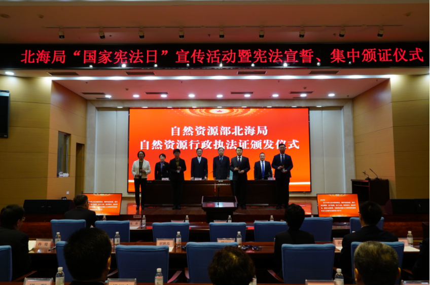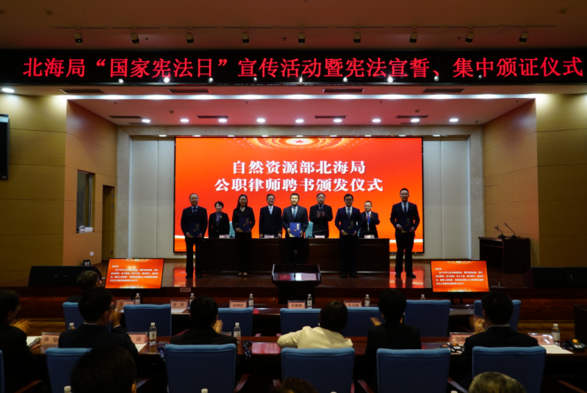 为深入贯彻落实习近平法治思想,提升依法行政能力和水平,全力推进北海区海洋自然资源管理“法治自然”建设,“国家宪法日”设立十周年之际,北海局组织颁发自然资源行政执法证,并向公职律师颁发聘书。