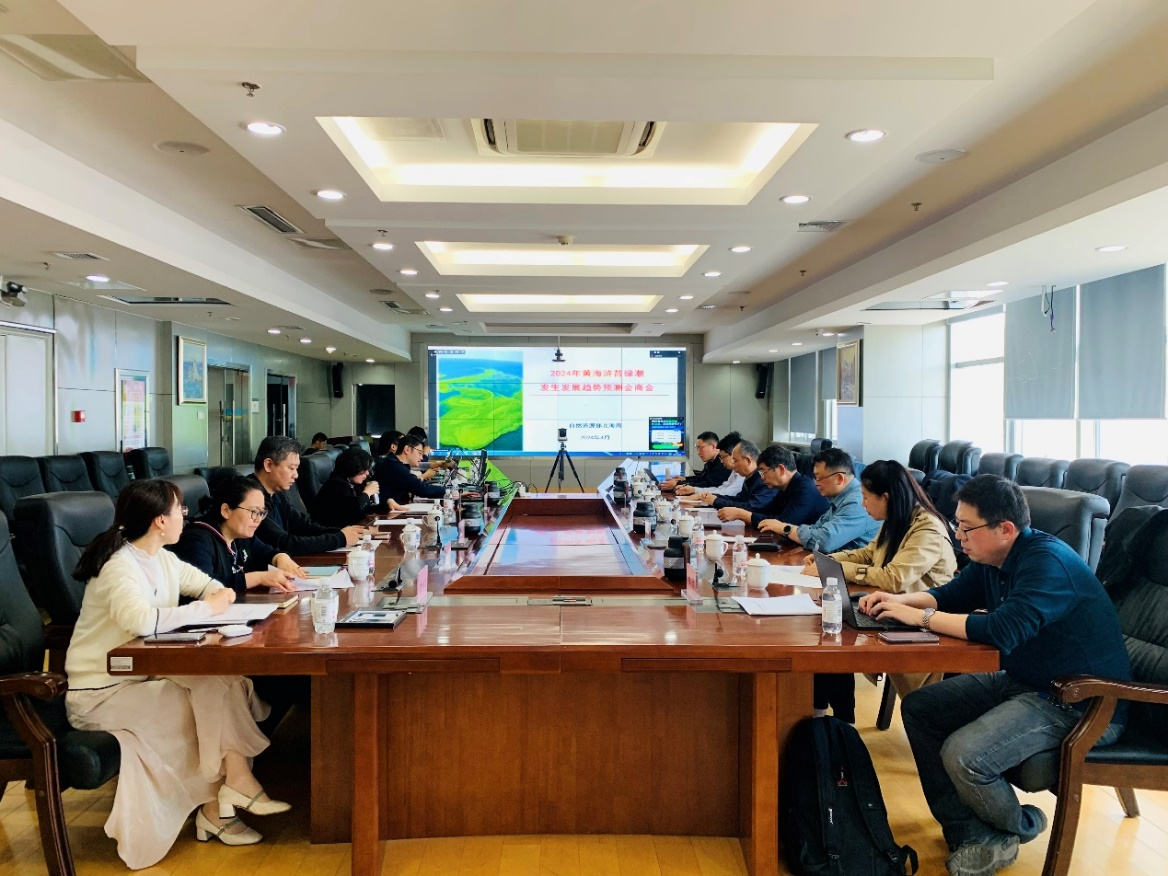 为践行习近平生态文明思想,进一步推进黄海浒苔绿潮灾害常态化防控工作,在自然资源部的统一部署指导下,2024年4月18日,自然资源部北海局在青岛组织召开了2024年度黄海浒苔绿潮发生发展趋势预测会商会议。来自国家海洋环境预报中心、国家卫星海洋应用中心、自然资源部海洋减灾中心、自然资源部第一海洋研究所、自然资源部东海局、上海海洋大学、中国科学院海洋研究所和中国科学院烟台海岸带研究所的领导和专家参加了会议。