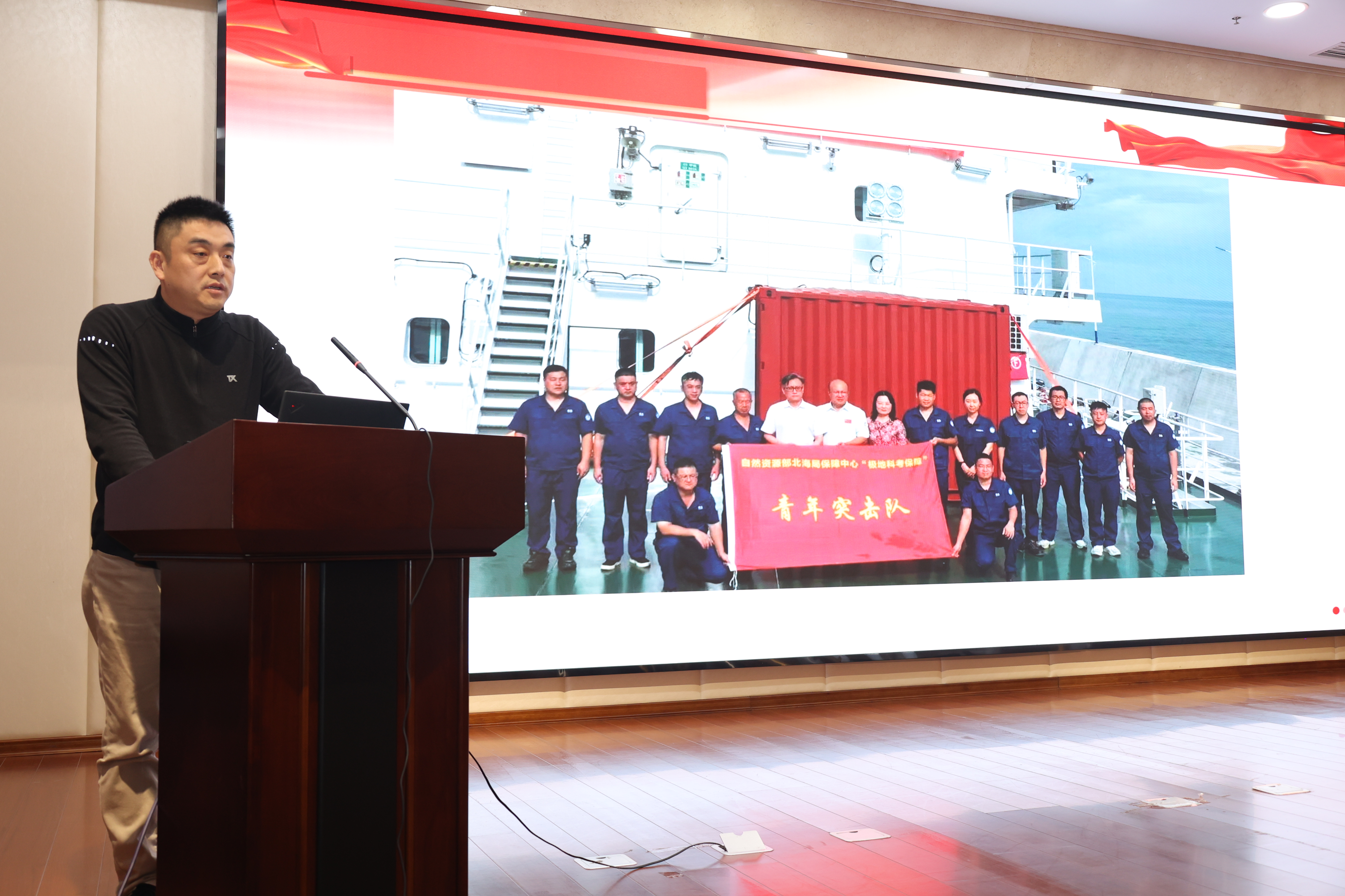 中心5位青年代表依次上台,围绕中心开展的主责主业,分享他们的青春奋斗故事。梁君威在报告中生动讲述了自己从监管督察领域的一名新手迅速成长为业务骨干的蜕变之路。范天宇的报告则深入解读生态保护修复监管领域的政策法规,并结合工作实践经验,分享了宝贵的工作心得与体会。韩建帅在报告中,结合执行“极地”号首航任务,详细介绍了中心“极地科考保障”青年突击队凭借专业知识,积极协作与努力,圆满完成首航任务的故事。胡宇的报告则讲述了他通过加强学习对极地考察事业认知不断升华的过程,以及在“极地”号首航中驾驶“拼搏”号气垫艇运送人员设备,并在试验区率先踏冰的故事。倪绍起在报告中,介绍了通过“四个抓落实”推动“星海互联”科技示范工程在中心落地生根的全过程。