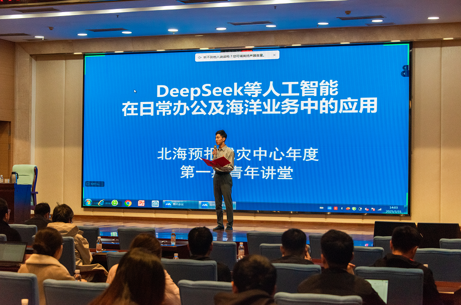 为深入学习贯彻习近平总书记关于网络强国、数字中国的重要论述,运用人工智能技术助推履职能力提升,北海预报减灾中心团委于3月31日下午,在局三楼多功能厅举办年度首期“青年讲堂”。本期讲堂以“DeepSeek等人工智能在日常办公及海洋业务中的应用”为主题,邀请中国石油大学(华东)任鹏教授、刘昊霖老师作专题讲座。本次活动得到了北海局直属机关团委和局属各单位的大力支持,北海局团员青年共计200余人通过线上线下相结合的方式参加了此次讲堂活动。