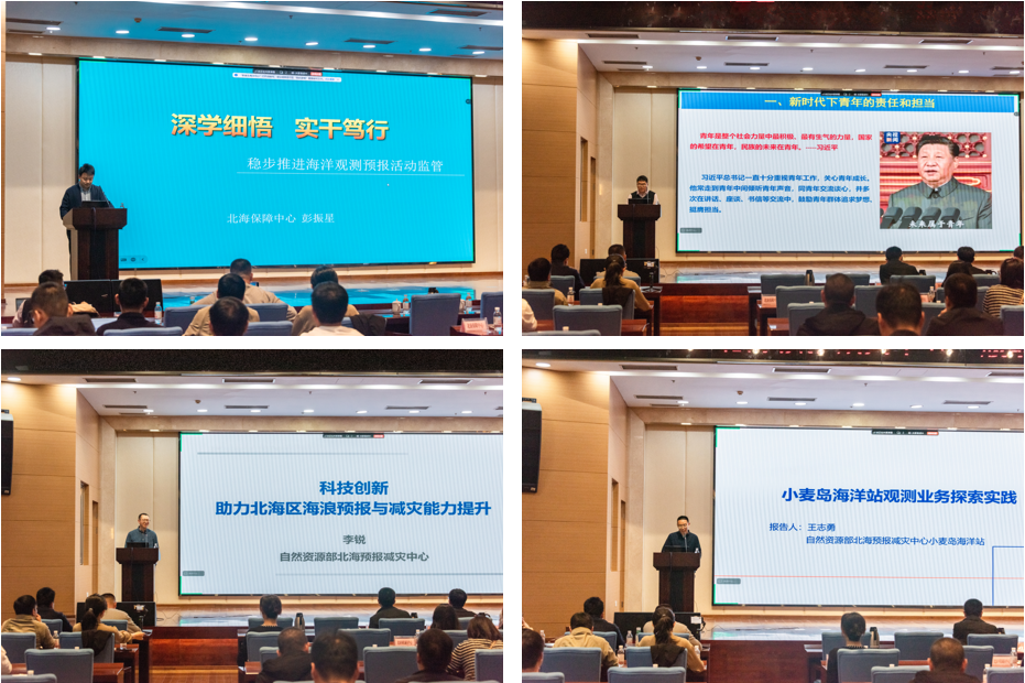 北海海洋技术中心王茂旭、大连海洋中心雷士永、烟台海洋中心刘畅作报告 本次活动为局属各单位团员青年提供了增进业务交流与知识共享的平台。广大团员青年纷纷表示,将扎根海洋强国建设一线,练就过硬本领,为全力推动海洋事业高质量发展挺膺担当。 (文字:北海预报减灾中心团委;图片:北海预报减灾中心团委) |