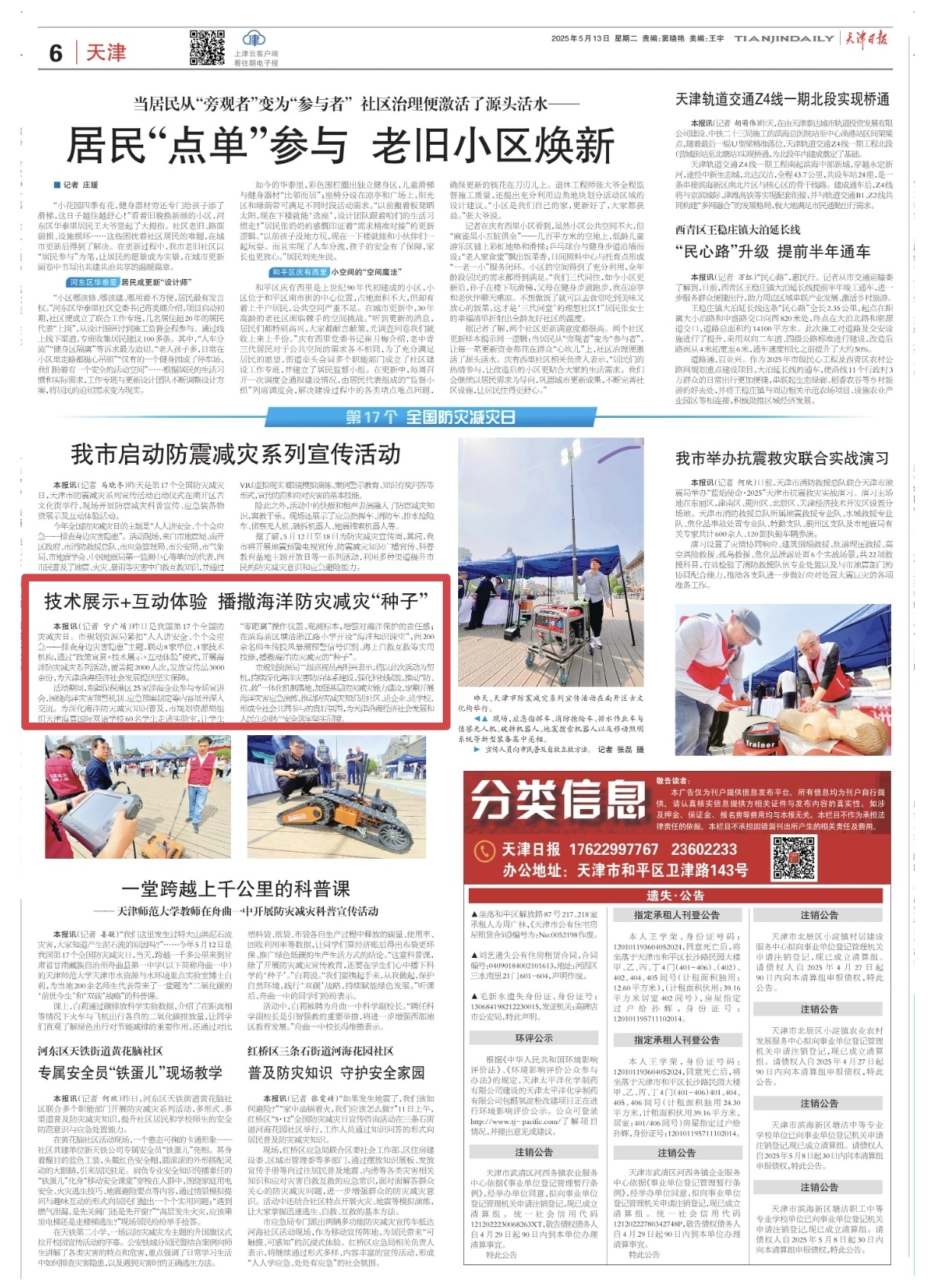 沿海重点隐患区电子屏、天津日报宣传 跨界联动 夯实应急能力基础 5月12日,在东疆亲海公园海洋防灾减灾宣传主会场,聚焦海洋灾害防范,通过宣传展板、互动讲解、宣传文创产品发放等方式,吸引众多市民和游客驻足参加。在滨海金隅嘉品商业广场,中心技术人员以通俗易懂的方式向周围社区居民介绍赤潮、风暴潮、海啸等海洋灾害科普知识。在东疆应急管理局,20余家涉海企业参加海洋观测预报活动监管宣讲会,进一步规范海洋观测预报活动,促进海洋观测预报事业健康可持续发展。