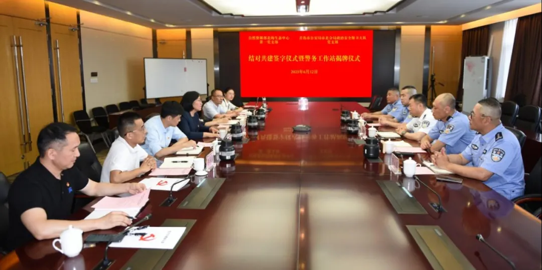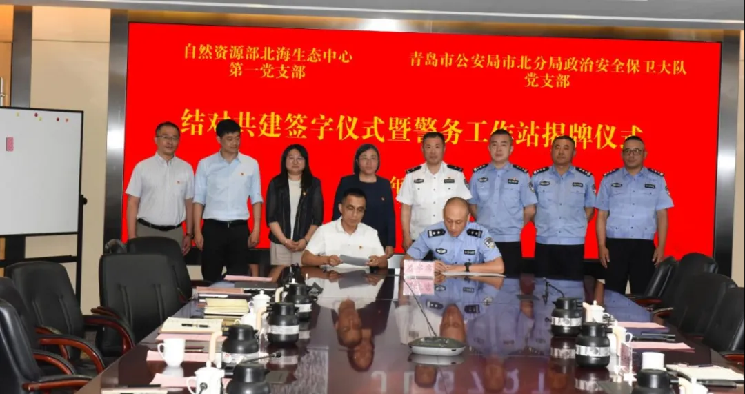 为深入学习贯彻习近平新时代中国特色社会主义思想,充分发挥党建引领作用,增进深化党支部间学习交流,促进支部共同发展,时值第24个全国“安全生产月”,2025年6月12日,北海生态中心第一党支部与青岛市公安局市北分局政治安全保卫大队党支部开展了结对共建活动,并为警务工作站揭牌。北海生态中心主要负责同志、青岛市公安局市北分局政治安全保卫大队主要负责同志以及双方党员代表参加了此次活动。