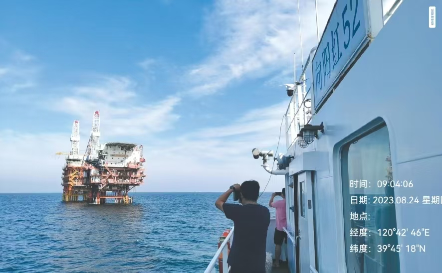 工作人员开展海域油气矿业权信息实地核查,依法监管海域油气勘查开采活动。