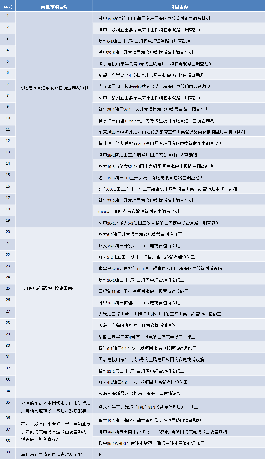 2021年自然资源部北海局铺设海底电缆管道行政许可办理统计