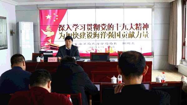 2017年12月28日,郭明克局长率检查组到中国海监第三支队和大连海洋环境监测中心站开展“履职尽责年”活动的督导检查,并为三支队和大连中心站的党员干部上了一堂题为“深入学习贯彻党的十九大精神,为加快建设海洋强国贡献力量”的专题党课。 郭局长概要解读了党的十九大报告的主要精神和党章(修正案)的主要精神,深入讲解了党的十九大报告对海洋工作的重要部署,明确提出了抓好党的十九大精神学习贯彻落实的具体意见。他勉励党员干部要不忘初心、牢记使命,求真务实,埋头苦干,奋力开创中国海监第三支队和大连海洋环境监测中心站各项事业新局面,为加快建设海洋强国做出新的更大的贡献! 郭明克局长率检查组深入三支队码头、中国海警1034艇,对抓好“履职尽责年”各项工作提出明确要求;听取了大连中心站领导关于业务楼建设施工情况的汇报,对推进业务楼建设工作提出了指导性意见。郭局长强调,要加大各项制度的执行力和落实力,建立“履职尽责年”工作的长效机制;全面加强党的建设,突出核心价值观教育,弘扬单位的文化理念,营造风清气正的良好氛围;强化责任担当,层层压实各级责任,形成齐抓共管的合力,推动事业发展。