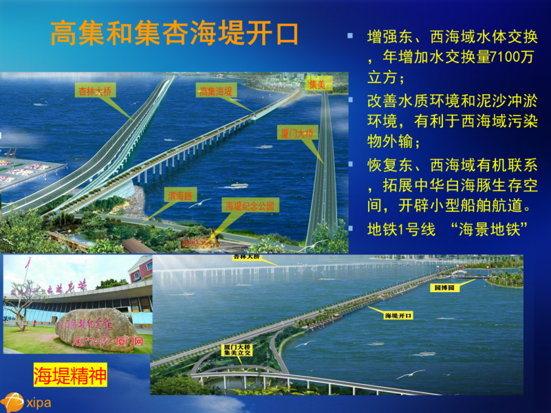 环东海域清淤疏浚生态整治后 沿同安湾建成的60公里长的滨海岸线,是厦门最具旅游度假魅力的“黄金海岸”,每年吸引游客约40万人。如今,这既是一条旅游浪漫线,也是高质量发展线。银谷智谷、环东云谷、美峰创谷、中关村大学科技园联盟成果转化基地吸引了各类新兴高新产业入驻,新城经济活力迸发,促进了周边土地和生态资源的溢价增值,反哺了政府前期生态修复投入,实现了生态产品价值转化和有序开发。 “得益于整个环东海域的生态修复,同安新城片区成为整个厦门市最具活力和潜力的产业增长极。这十几年的发展说明,高水平的生态修复和高品质的生态环境是高质量发展的支撑。”厦门市同安新城指挥部负责人郭三温说。 “厦门实践”向海湾整体延展—— 海堤,在厦门历史上发挥了重要作用,饱含数百万厦门人民感情, “海堤精神”是厦门城市精神的象征,激励着一代又一代厦门人自强不息。然而,长2200多米的高集海堤阻隔厦门东、西海域,海水无法自然交换,水动力大为减弱,使厦门东、西海域成为半封闭的港湾,造成海洋生态环境恶化,每年都要耗费巨资清淤。 打开海堤,是一个伤筋动骨的“大手术”,对厦门人民尤其是当年的建设者来说心情沉重。到底打开多少、如何打开,只有科学论证,才能抚慰曾作出重大贡献的先辈,也才能更好地造福厦门的未来。来自自然资源部第三海洋研究所、厦门大学的两支科研团队背靠背严谨论证,政府、公众、科学家共同探讨,最终得出的结论是:海堤开口800米~1000米,与全部开口具有相同的效果。保留一部分海堤,可以让后人缅怀和弘扬厦门建设国内第一条跨海通道的“海堤精神”,意义深远。 2010年,厦门市决定将海堤开口800米,同步启动建设“海堤精神”纪念馆。2016年完工后,东海域可向西海域日净输送水7100万立方米,纳潮量增加4400万立方米,水交换能力提升30%,海水半交换周期从15天缩短为7天。从此,厦门东、西海域通畅了“经脉”,半封闭的海湾变成开放式通透性的海湾,厦门整个西海域、同安湾海域环境容量得以最大拓展,海洋生态廊道得以通畅,保住了中华白海豚等珍稀野生动物的生存空间。此后,厦门其余6座海堤陆续全部打开并开展清淤。 海堤的打开,对厦门市整个生态修复起到了最关键的作用,并加速实现跨岛发展的战略部署,实现了湾区生态系统质量提升与经济发展双赢,再次为全国作出示范。