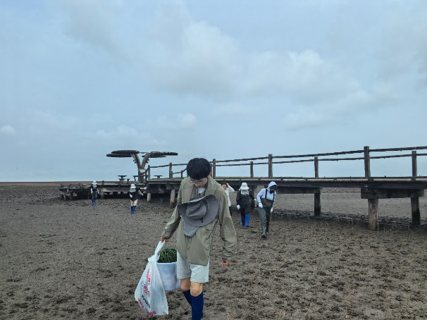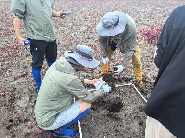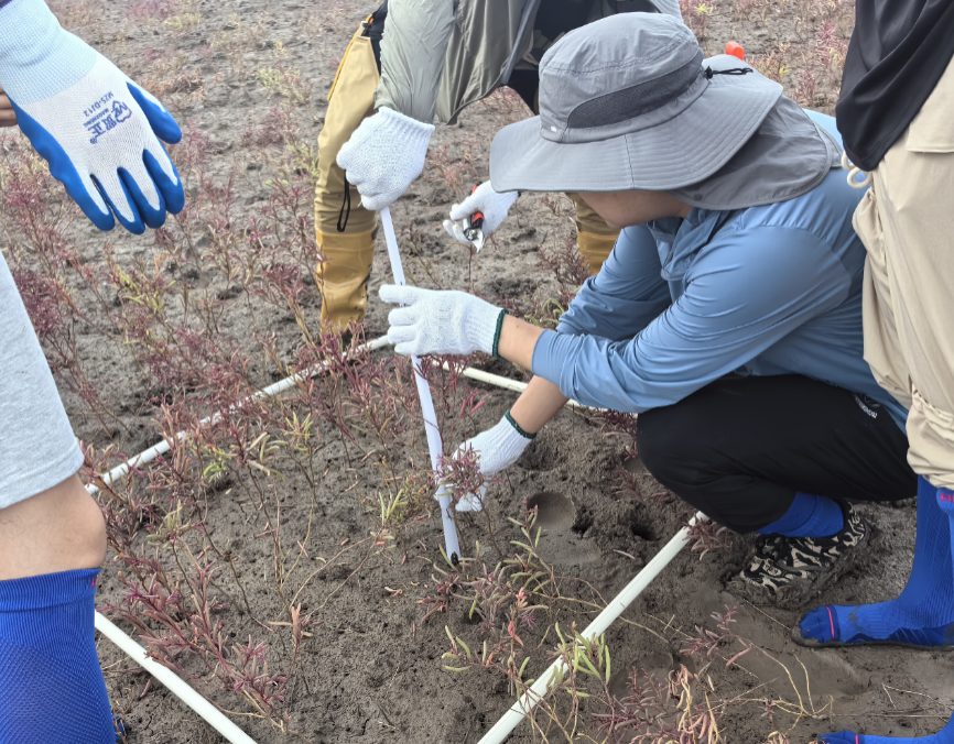 中心副主任王其松参与此次生态样地调查工作 初到湿地时,天空不作美,下起了绵绵细雨,但这丝毫没有影响到这些年轻工作者的决心和热情。他们穿上了更便于在泥地里行走的运动袜,手持各种采样工具,小心翼翼地踩在湿地上,每一步都充满着对脚下这片脆弱生态系统的尊重。在此次外业首席季广的指导下,他们采集土壤样本,记录植物种类、数量和分布,利用休整时间监测鸟类活动,每一项工作都细致入微,力求获取最准确的数据。