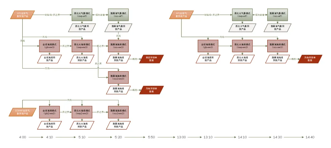 业务化海浪数值预报流程 在一次预报值班工作中,李锐偶然发现,中心海浪数值模型对北海区的波高预报总是比浮标观测值偏小。由于前期摸清了数值预报模型的原理,他很快发现,之前的海浪数值模型里的参数化方案是适用于开阔大洋的,针对渤海和黄海这种半封闭海域没有专门考虑。于是李锐迅速开展专项技术攻关,把数值模型里和波高预报相关的物理量都梳理了出来,然后开始大量的数值实验,在开展了33组、每组模拟时间长达1年的海浪数值模拟实验后,筛选出了波高模拟精度最高的物理参数设置,最终形成了一套适用于渤黄海的海浪数值模拟方案。利用这套方案优化海浪数值预报模型,李锐将北海区近海浪高预报误差从21%降低到16%,对近岸波高预报的准确度居国内同类产品前列,有效提升了北海区业务化预报水平。