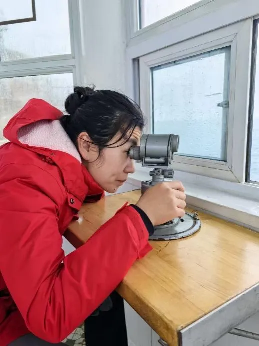 值班室、观测场、测波室、验潮室四点一线构成了她每天的工作路线,观测、清检、校对、检查循环往复的工作贯穿了每一天。盛夏,岛上蚊虫滋扰,鼠蛇潜行,办公楼纱窗上的壁虎、宿舍墙缝的蝎子、晚上光顾厨房的老鼠、观测场草丛里的蛇,她由原来的害怕也慢慢变得见怪不怪,她笑称自己是个标准的“女汉子”。寒冬,海风如刃,凛冽刺骨,海岛工作最难熬的便是寒潮来临的时候——狂风夹杂着雨雪打在脸上如刀割一般,办公楼通往测波室的那条200米的小路步履艰难。每当应急响应或海浪达到加密观测标准时,工作节奏就变得异常紧张,经常是刚刚完成这一时次的数据上传,又要投入到下一整点的观测中。尤其是在冬季,气温极低,测完海浪后,手指冻僵得难以握笔,脸颊也被寒风冻得麻木。她用实际行动诠释了“责任”和“担当”的真正含义,展现了新时代新青年的坚韧与决心。