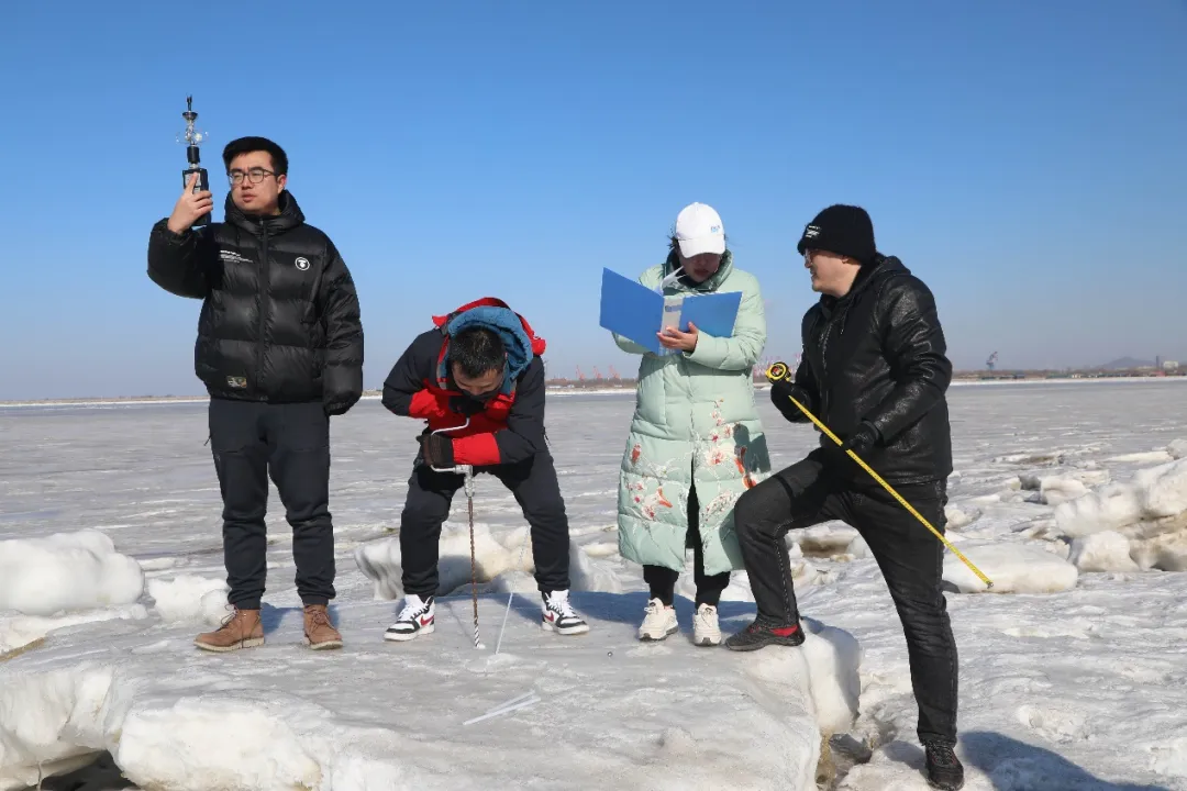 在大连海洋中心有这样一只青年队伍。他们积极冲锋在“急难险重新”任务一线,他们的足迹西起山海关,东至丹东鸭绿江口,以甘于奉献、勇于担当精神和过硬的知识本领支撑起辽宁海域的海洋观测预警报、海洋生态保护修复、海域海岛资源监视监测等重点工作。他们追着台风路径现场调查,身处严寒采集海冰数据,顶着酷暑在辽宁3000多公里海岸线上开展生态调查。不惧,展示青年勇气;不退,彰显青年担当。他们像海豹一样坚韧不拔、游刃有余,他们是中国海岸线最北端的守护卫士,他们是海洋事业的接班人和未来发展的推动者,他们就是大连海洋中心海豹突击队! 与冰起舞 和风同行 开展海冰预警工作,全力保障地方经济发展和人民生命安全。2024年1月,突击队员全力以赴开展海冰应对工作,在冰雪严寒中对盘锦港等13处海域开展近岸海冰调查工作共计73次,获取了冰温、冰厚等多项海冰要素现场资料。2024年2月6日发布了我国今冬首个海冰黄色预警,很多突击队员24小时坚守在第一线,自愿放弃春节与家人团聚的时光。