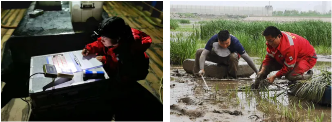 水动力监测、盐沼植被调查 攻坚克难的监测尖兵 海洋监测的战场从不缺少挑战,团队青年始终冲锋在急难险重一线。2015年“8・12”天津港重大火灾爆炸事故突发,团队第一时间响应,在有毒有害气体弥漫的现场连续奋战46天。白天现场采集水样,夜晚实验室分析数据,累计提交监测快报41期,为抢险救援和生态风险管控提供了“精准导航”。