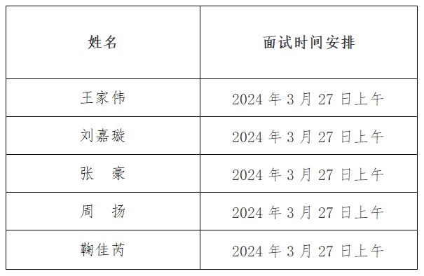 二、面试内容和方法 (一)面试内容 面试重点考察应聘人员适任岗位所需的专业能力和综合素质。 (二)面试方法 采取半结构化面试的方法。考生先通过PPT进行自述,再进行结构化面试。自述内容包括学习经历、学术水平、科研成果等。每名考生面试时间为20分钟,其中自述时间5分钟,结构化面试时间15分钟。 三、面试确认 2024年3月22日下午17:00前,参加面试人员发送邮件至自然资源部北海局机关事务中心邮箱(jgfwzx@ncs.mnr.gov.cn),确认是否参加面试。 确认参加面试的考生需填写《自然资源部北海局机关事务中心面试人员信息表》(见附件1),签名后上传PDF文件。邮件标题格式:“岗位名称”+“姓名”+“身份证号后四位”+“确认参加面试”,样例:“基本建设管理岗位张三0000确认参加面试”。 放弃面试的考生需填写《放弃面试声明》(见附件2),签名后上传PDF文件。邮件标题格式:“岗位名称”+“姓名”+“身份证号后四位”+“放弃参加面试”,样例:“基本建设管理岗位李四1111放弃参加面试”。 逾期未确认的视为放弃参加面试。 四、面试资格复审 (一)资格复审时间:2024年3月26日上午9:00—11:30;下午13:30-15:00。 (二)资格复审地点:自然资源部北海局综合楼一楼(山东省青岛市崂山区云岭路27号) (三)考生须携带以下材料进行资格复审: 1.身份证原件及复印件; 2.已取得的各阶段学历、学位证书原件,留学生需持教育部学历学位认证证书; 3.2024年应届毕业生需携带学校盖章的就业推荐表原件,择业期内未落实工作的考生需携带三方协议; 4.个人自述PPT光盘。(注意:资格复审当天需审查个人自述PPT文件内容,文件内不得以任何形式透露姓名、身份证号、籍贯、导师姓名、亲属姓名、就读院校等个人信息。) 凡提供虚假材料的考生,一经查实,取消面试和录用资格。 五、面试时间及地点 (一)面试时间:2024年3月27日上午9:00。 对考生实行入闱封闭管理,考生应于8:30前进入候考室,进行身份确认、抽签确定面试次序、签订保密承诺书。8:50仍未到者,取消面试资格。 8:40开始抽签确定考生和职位次序。抽签开始时未到达候考室,但8:50之前到达的,剩余签号作为该面试人员顺序号;如若两人以上在上述时间段内到达的,按到达先后以剩余签号作为面试人员顺序号。 (二)面试地点:自然资源部北海局综合楼一楼,请考生注意楼内指示牌。 (三)面试当天考生须携带身份证原件。 六、其他事项 (一)参加面试的考生进入候考室后,须将手机等通讯设备关闭,交由工作人员保管。考生由工作人员引领进入面试考场。 (二)面试期间考生食宿及交通费用自理。 (三)面试当天有关要求 请面试人员预留充足入场时间,建议至少提前30分钟到达面试地点,以免影响面试。 如受特殊影响变更,另行通知公告,请密切关注北海局政府网站。 联系人:崔老师 联系电话:0532-58750993 附件: 1. 自然资源部北海局机关事务中心公开招聘面试人员信息表 2. 放弃面试声明 |