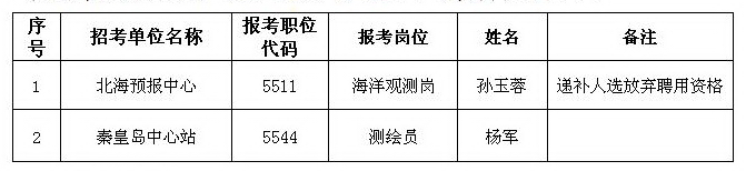 按照自然资源部北海局所属事业单位2022年公开招聘工作安排,体检考察对象因个人原因主动放弃应聘,或未通过体检考察,或自愿放弃聘用资格的,该岗位按照成绩依次递补。现体检考察递补人员名单(第二批)公告如下(按岗位排序):