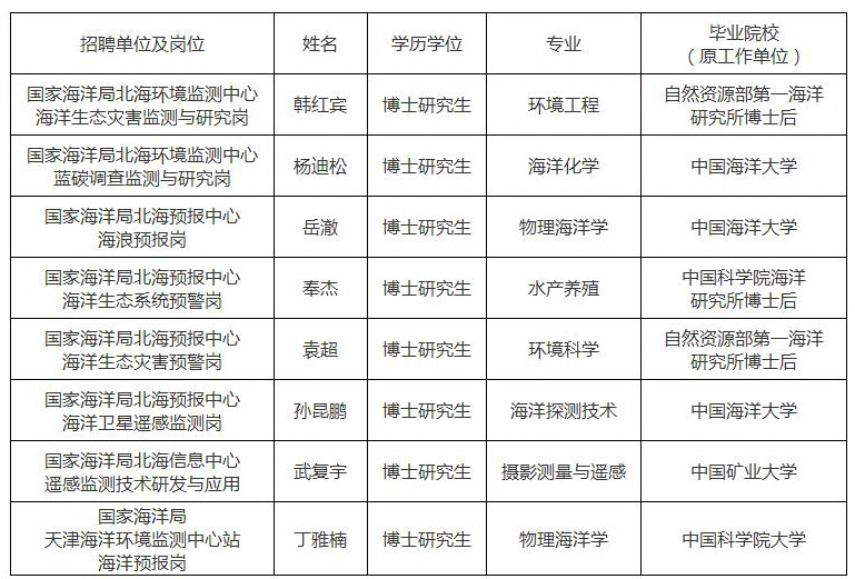 国家海洋局北海海洋工程勘察研究院/环境调查2岗位、国家海洋局大连海洋环境监测中心站/实验室监测岗位、国家海洋局天津海洋环境监测中心站/自然资源调查与评价岗位因无人报考或无人参加面试,取消3个岗位此次招聘。国家海洋局北海环境监测中心/海洋资源遥感调查和监管岗位、国家海洋局秦皇岛海洋环境监测中心站/海洋生态监测评岗位因考生个人放弃,取消2个岗位招聘。 公示时间:2022年9月23日至10月8日 受理电话:0532-58750177 通信地址及邮编: 山东省青岛市崂山区云岭路27号 自然资源部北海局 266061 |