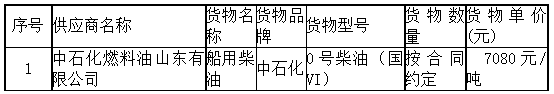 一、项目编号:0656-2440B0000374(招标文件编号:0656-2440B0000374) 二、项目名称:自然资源部北海局船用柴油项目 三、中标(成交)信息 供应商名称:中石化燃料油山东有限公司 供应商地址:山东省青岛市崂山区同安路886号荣柏财富中心B座8层 中标(成交)金额:272.4664200(万元) 四、主要标的信息