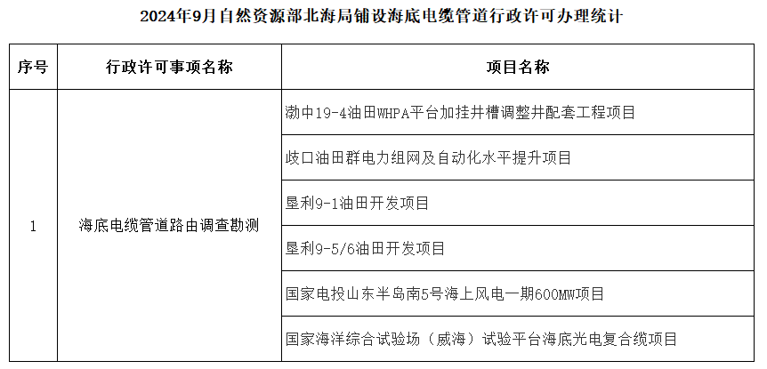 2024年9月自然资源部北海局铺设海底电缆管道行政许可办理统计
