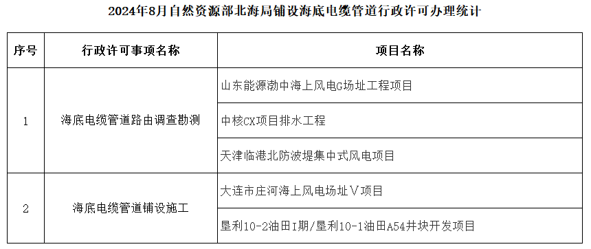 2024年8月自然资源部北海局铺设海底电缆管道行政许可办理统计