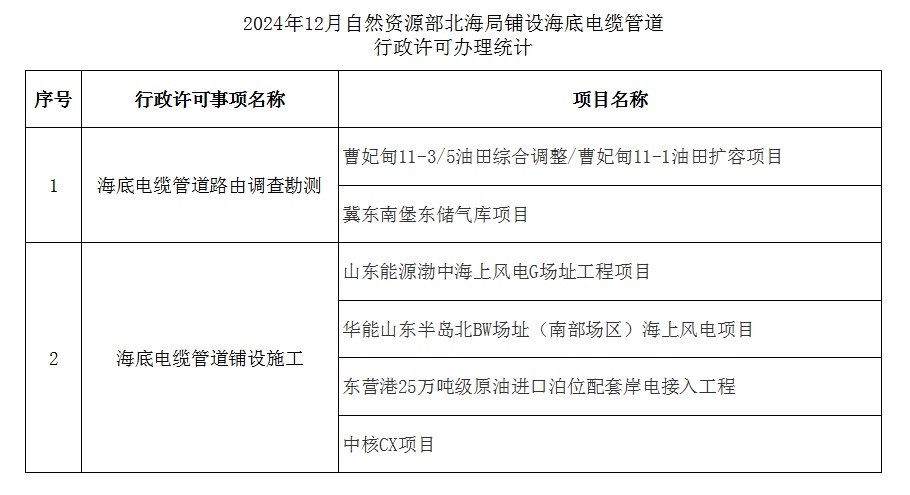 2024年12月自然资源部北海局铺设海底电缆管道行政许可办理统计